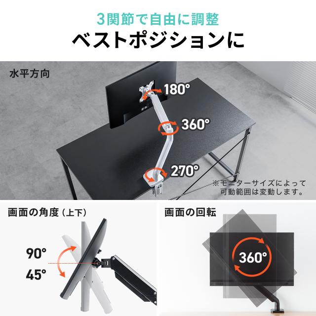 モニターアーム シングル ガス 32インチ 上下 左右 耐荷重12kgまで対応 [100-LAC003]