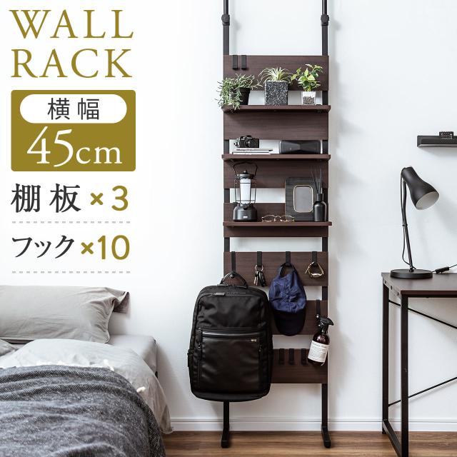 突っ張り棚 突っ張りラック 幅45cm シェルフ 棚 3段 壁面収納 ウォールシェルフ 間仕切り キッチン 玄関 パントリー スリム 工事不要 木目調 ダークブラウン ホワイト[100-TSF001]