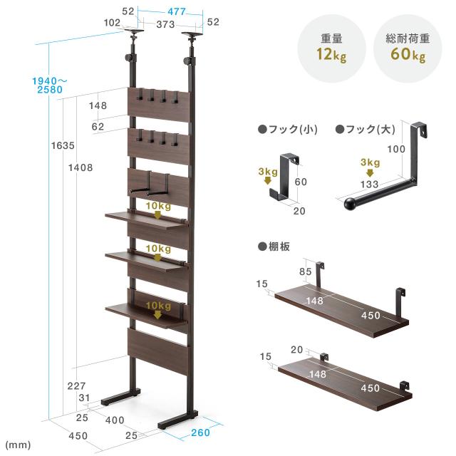 ■総耐荷重:60kg(各棚板/10kg、各フック/3kg)