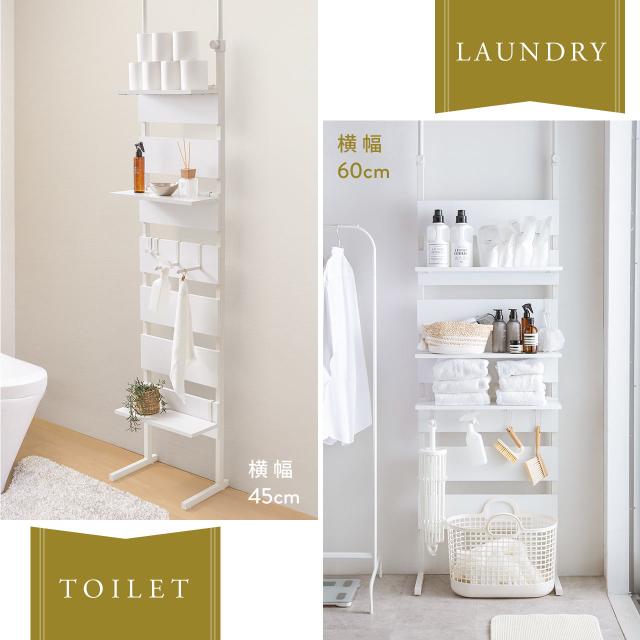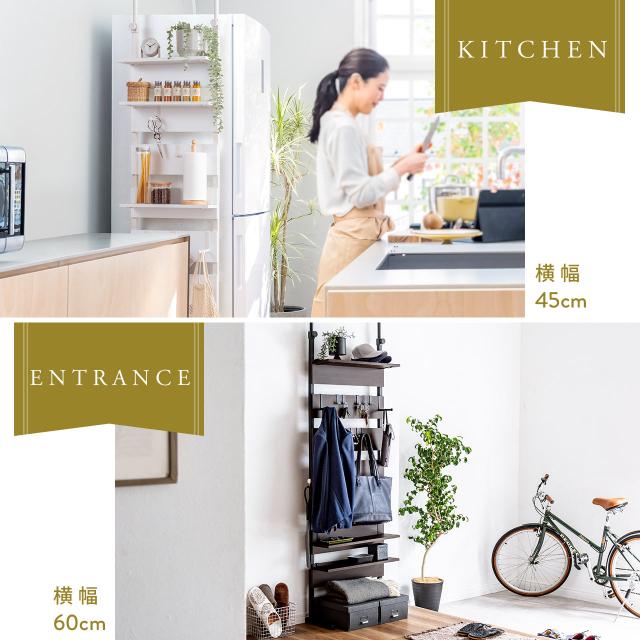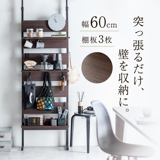 突っ張り棚 突っ張りラック 幅60cm シェルフ 棚 3段 壁面収納 ウォールシェルフ 間仕切り キッチン 玄関 パントリー スリム 工事不要 木目調 ダークブラウン ホワイト[100-TSF002]