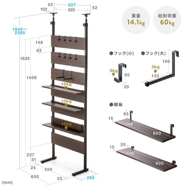 ■総耐荷重:約60kg(各棚板/10kg、各フック/3kg)