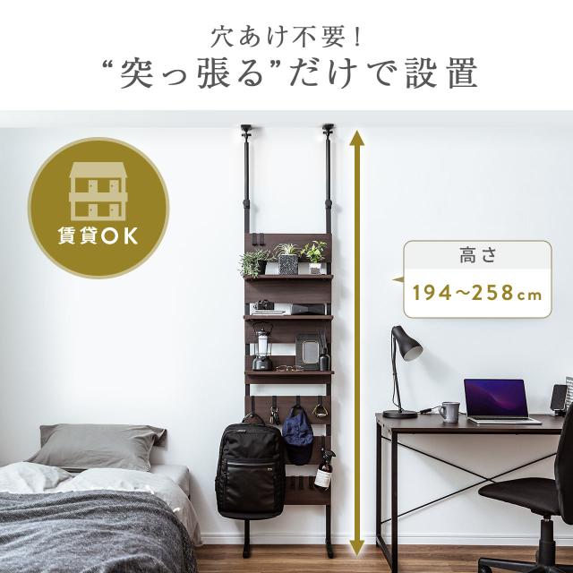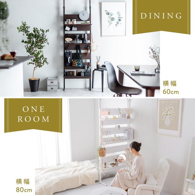 ⇒ご購入の前にご確認下さいリビングやダイニング、玄関やキッチンなど、お部屋のいろいろな場所に設置できる突っ張り式ラック。壁に穴を開ける必要が無いので、マンションやアパートなどの賃貸でも設置が可能。パーテーションや間仕切りにもおすすめ。幅60cm。ダークブラウン。【WEB限定商品】