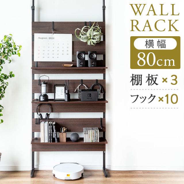 突っ張り棚 突っ張りラック 幅80cm シェルフ 棚 3段 壁面収納 ウォールシェルフ 間仕切り キッチン 玄関 パントリー スリム 工事不要 木目調 ダークブラウン ホワイト[100-TSF003]