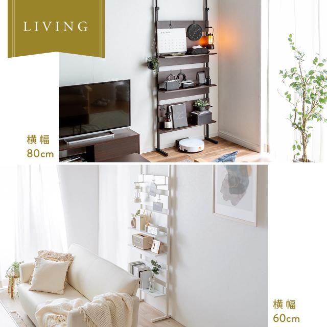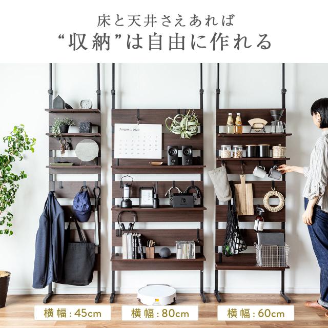 ⇒ご購入の前にご確認下さいリビングやダイニング、玄関やキッチンなど、お部屋のいろいろな場所に設置できる突っ張り式ラック。壁に穴を開ける必要が無いので、マンションやアパートなどの賃貸でも設置が可能。パーテーションや間仕切りにもおすすめ。幅80cm。ダークブラウン。【WEB限定商品】