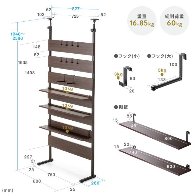 ■総耐荷重:約60kg(各棚板/10kg、各フック/3kg)