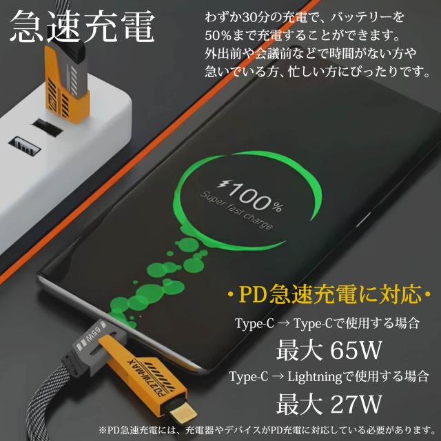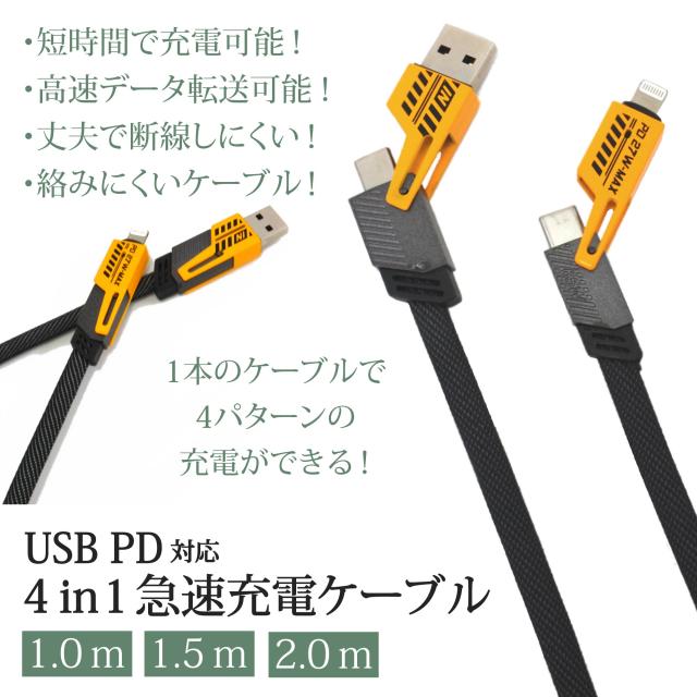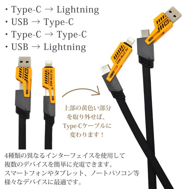 4in1 充電ケーブル PD対応 Type-C ケーブル 急速充電 65W 27W ライトニング USB-A iPhoneケーブル Lightning データ転送 同期 iPhone16 iPhone15 スマホ充電 便利 マルチケーブル PC タブレット iPad Galaxy Xperia OPPO Google Pixel 4種類 USB充電ケーブル
