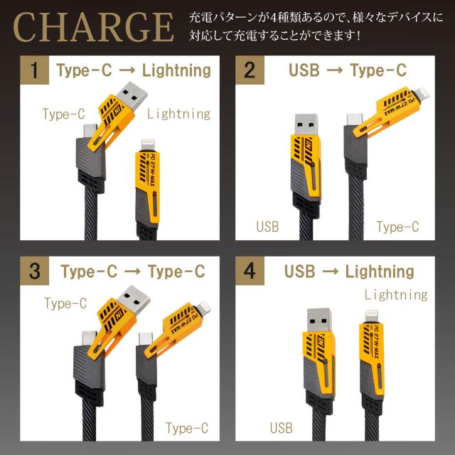 4種類の異なるインターフェイスを使用して複数のデバイスを簡単に充電できるケーブルです。