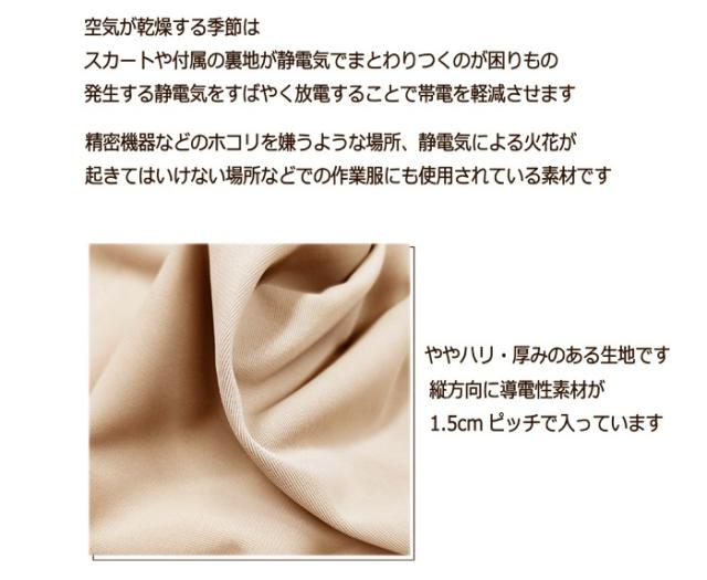 静電気が起きにくい素材とは違い、起きた静電気をすばやく放電することで衣服内の帯電をおさえ静電気を感じにくくするペチコートです