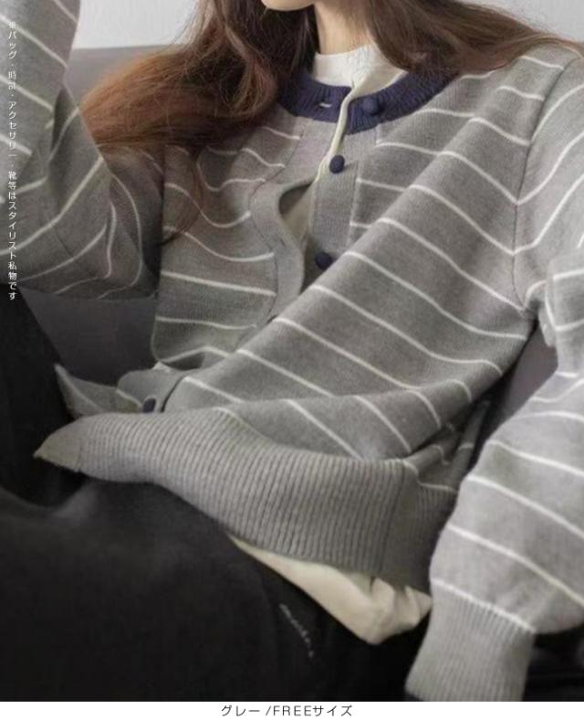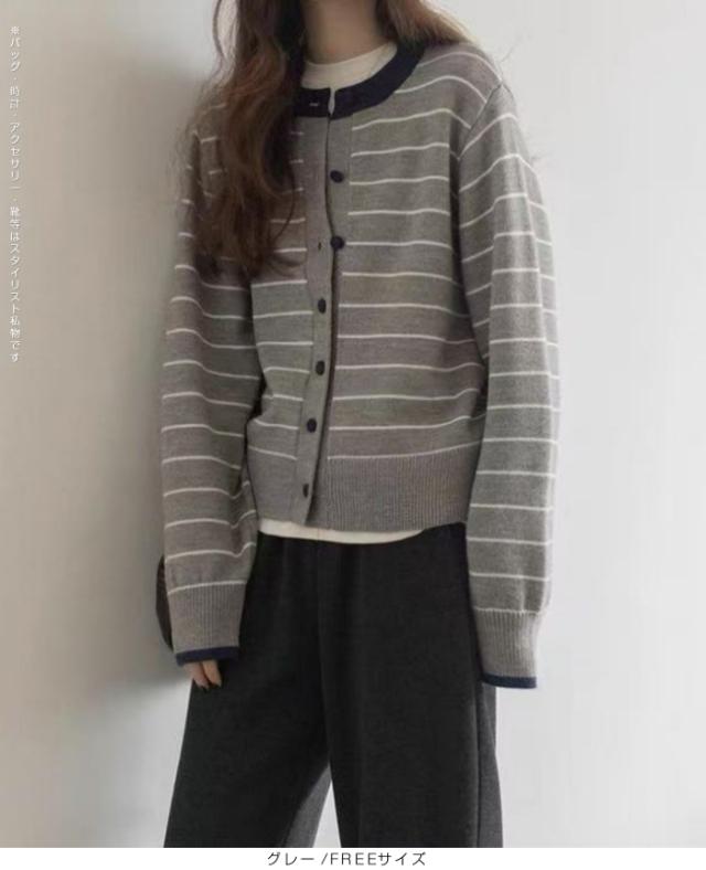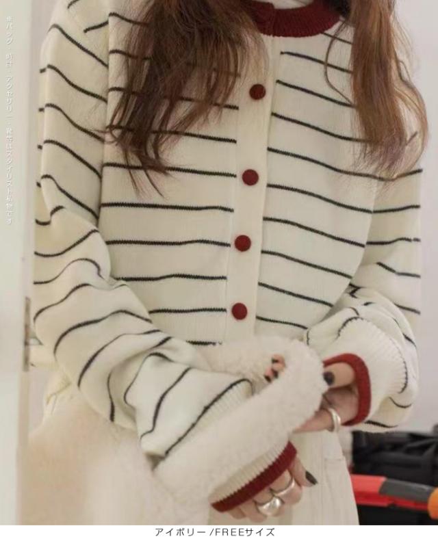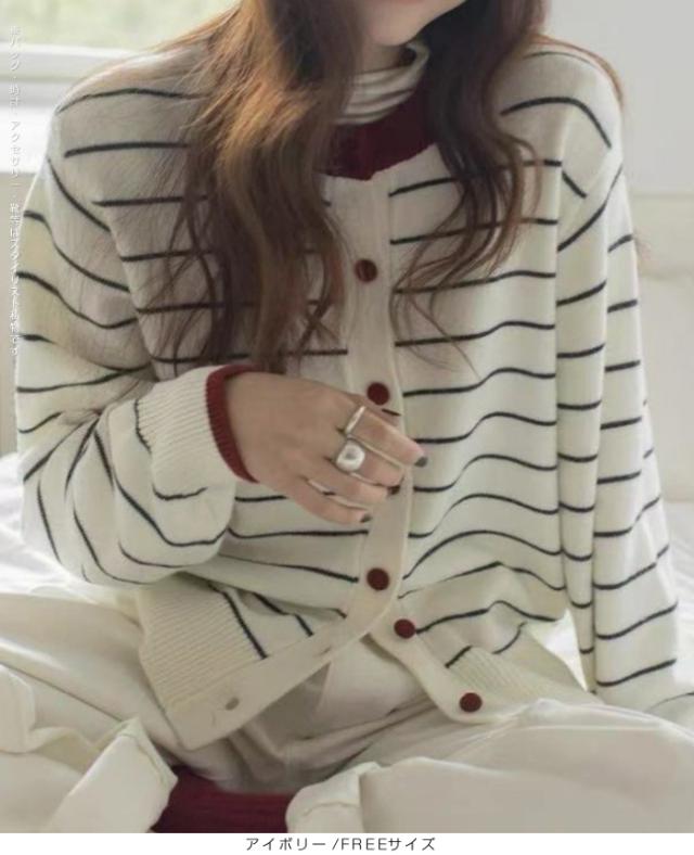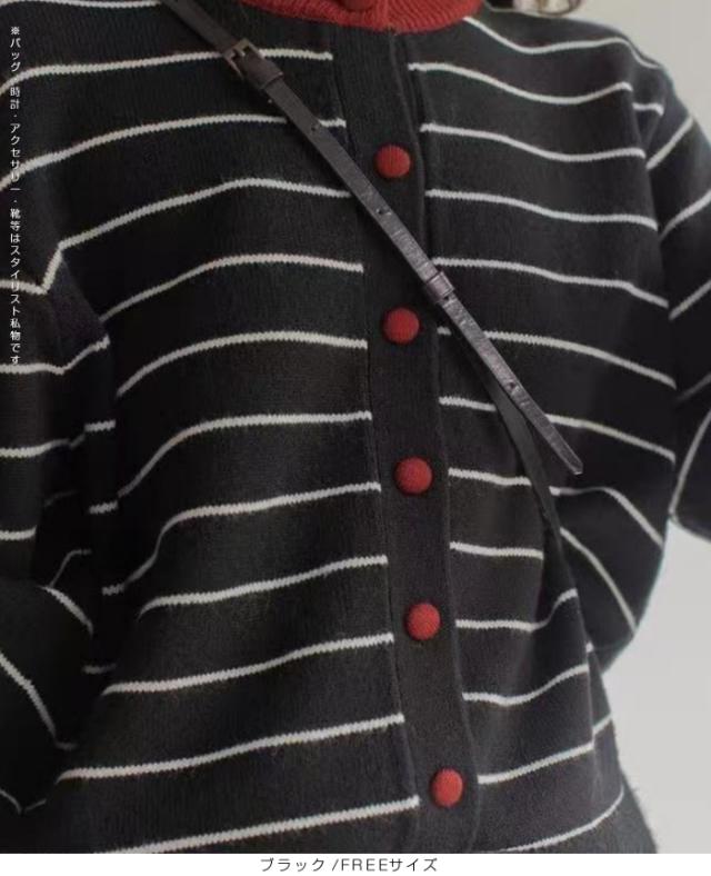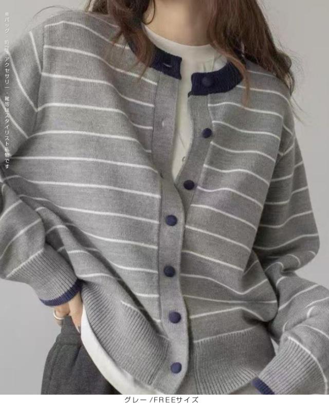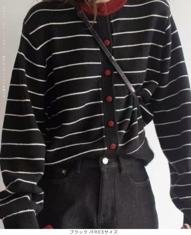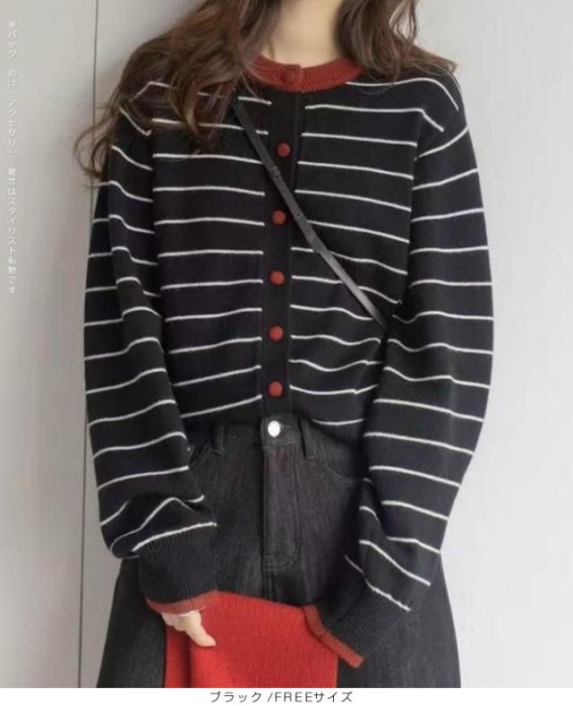 配色ボタンがアクセントのボーダーカーディガン。