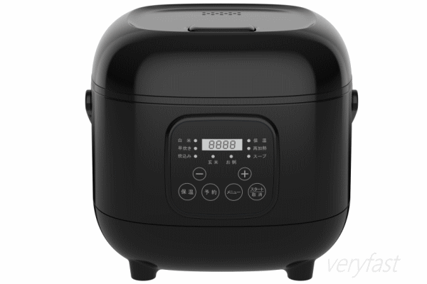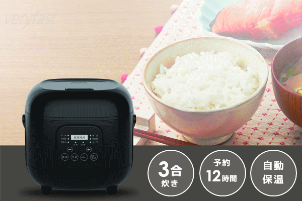 いつでもお米がふっくらいおいしく炊き上がる!お部屋になじみやすいシンプルなデザインでコンパクトな食べきりサイズの炊飯器。わかりやすいデジタルパネルとシンプルなボタンで簡単に操作が可能。内蓋は取り外して水洗い可能なので清潔に使用できます。取り付け、取り外しも簡単です。本体の持ち運びや収納に便利な取っ手付きです。■寸法約W233×D242×H206mm■重量約2kg■電源AC100V 50/60Hz■消費電力350W■最大炊飯容量約0.54L(3合)■蒸発水量10g※1回の炊飯■予約1時間〜12時間■保温12時間まで■コード長さ約1m■材質:PP、アルミ■セット内容:本体、内ぶた、内釜、計量カップ、しゃもじ、電源コード、取扱説明書(保証書)■タイプ:マイコン式■メニュー:白米、早炊き、炊込み、玄米、お粥、スープ、再加熱、保温■カラー:ブラック※早炊きコース約35分は目安時間であり実際の炊き上がり時間とは異なる場合があります。実際の炊き上がり時間は室温・水温・電圧・水加減等によりかわります。本製品は一般家庭用です。業務用にご使用ならないで下さい。