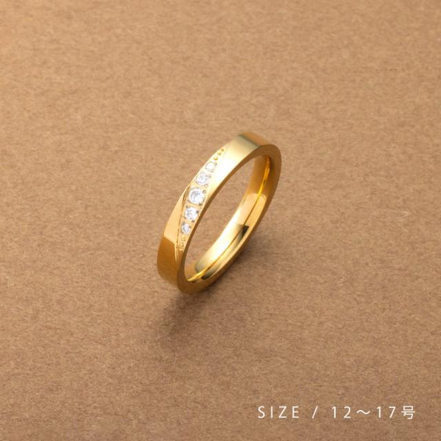 大きさの異なる煌めくビジューを斜めに配したデザインリング。大人な雰囲気を纏うシンプルなリングは、一つ持っておくと重宝します。錆びにくく傷に強いステンレス製で、デイリーに活躍◎長時間の着用も安心の低アレルギー素材です。