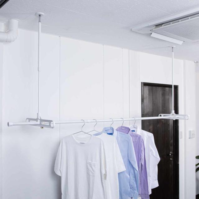 天井から吊下げることができる室内物干しです。アーム付きで左右に2本の竿を掛けることができます。必要な時に天井に取り付け、物干しスペースを簡単に作ることができます。