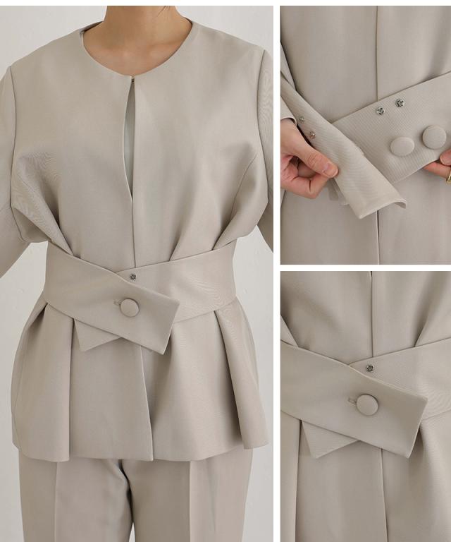 ジャケット、パンツ、ベルトの3点が揃った上品なセットアップスーツです