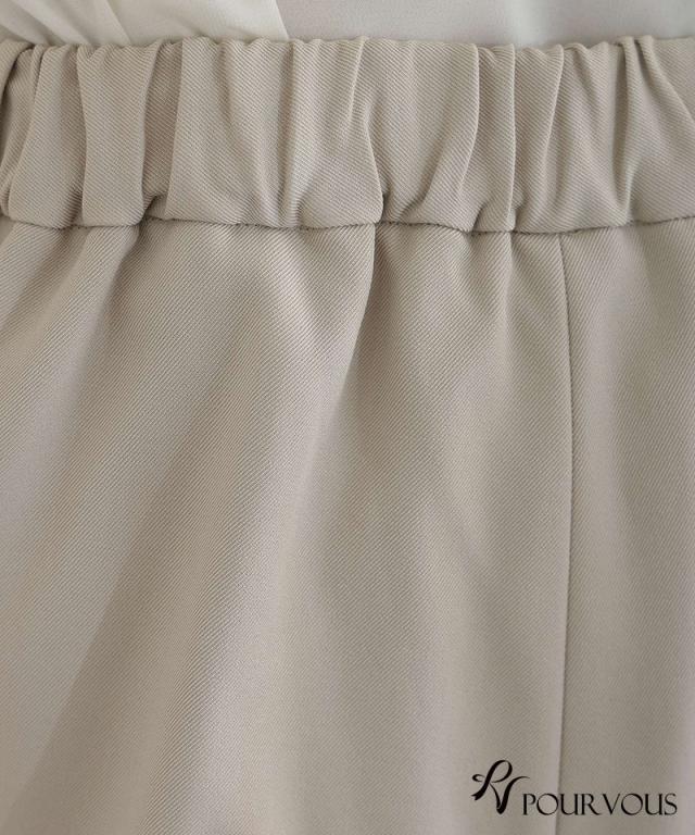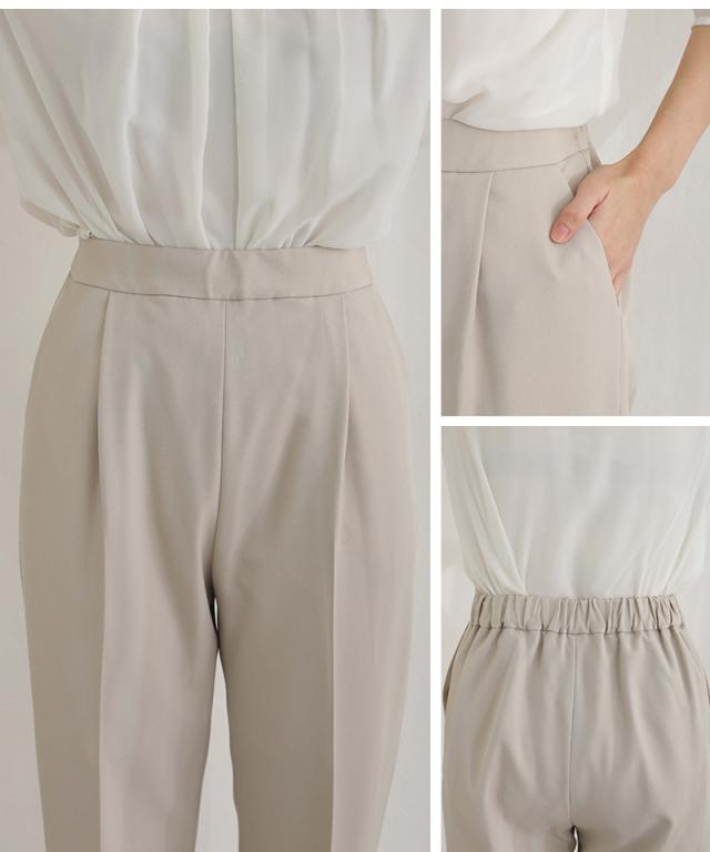 体のラインを拾わないゆったりシルエットのパンツは、背面ゴム仕様で楽なフィット感