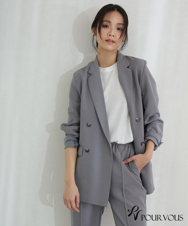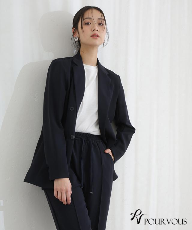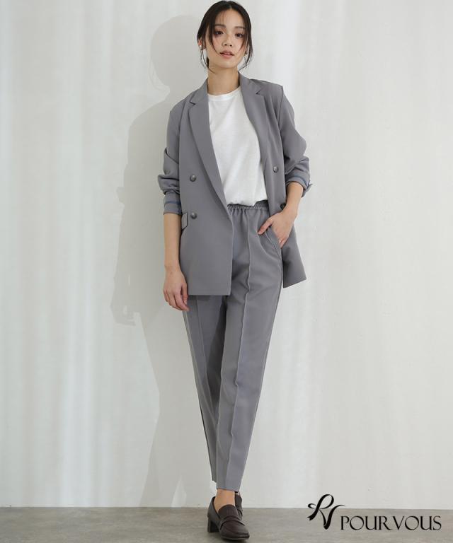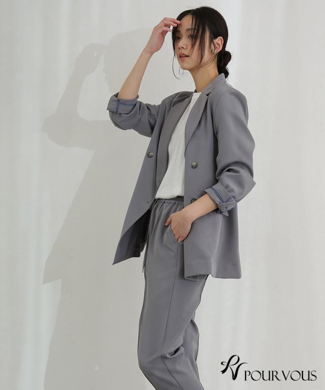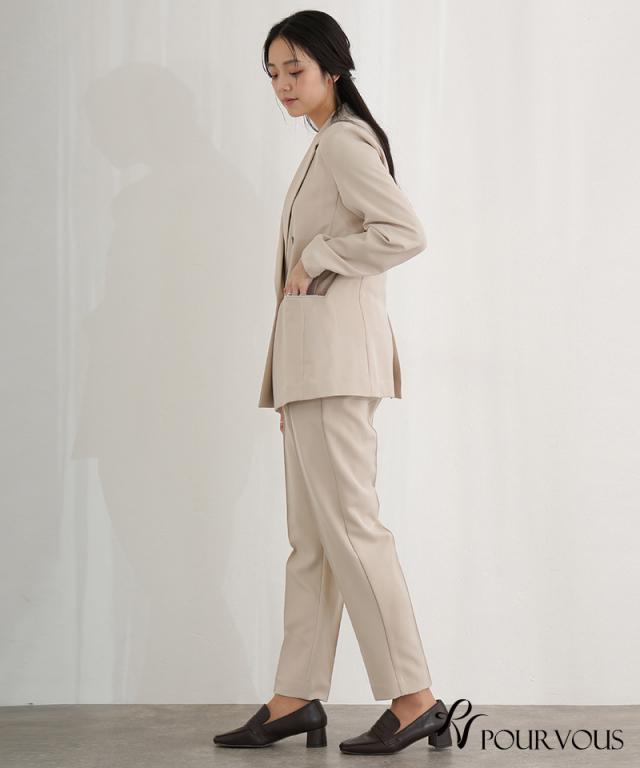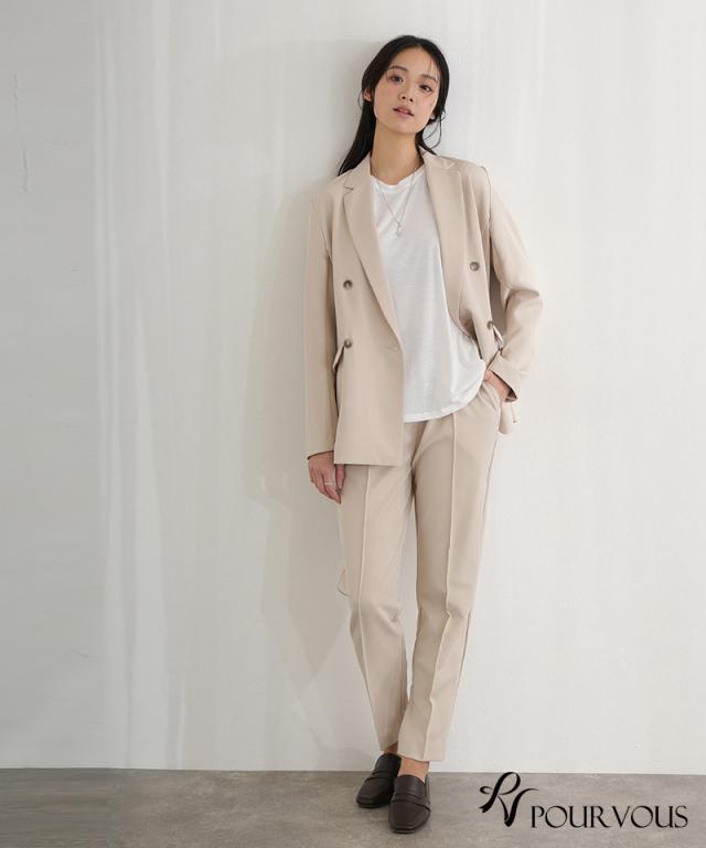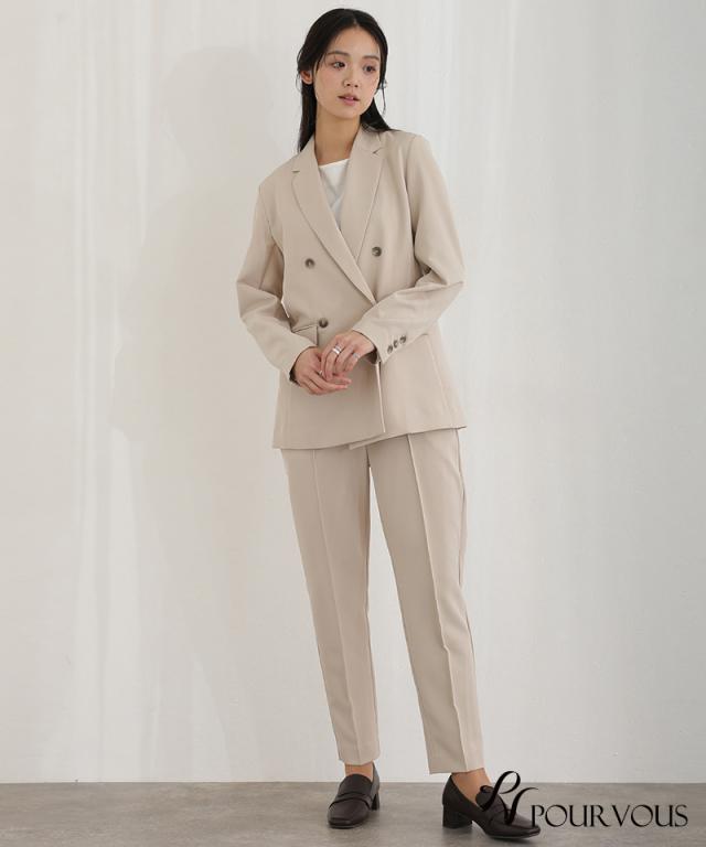 ダブルカラーのジャケットと美しいセンタープレスパンツでスタイリッシュな印象に。