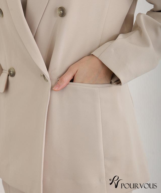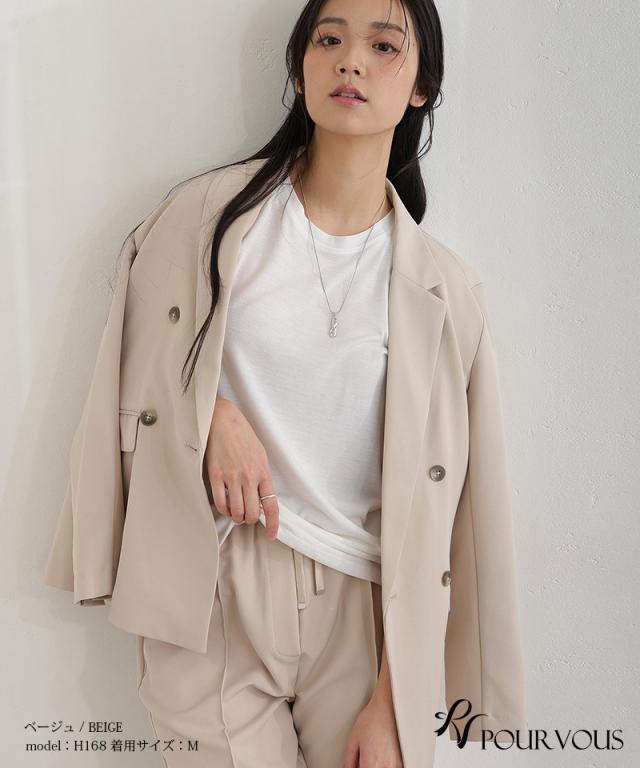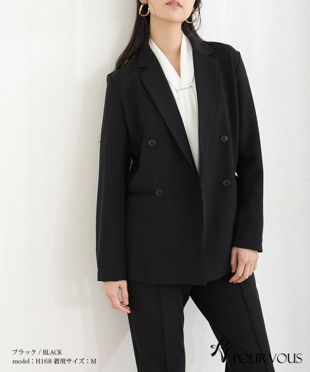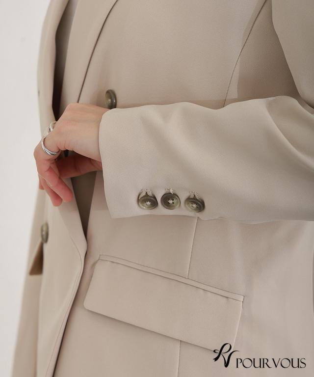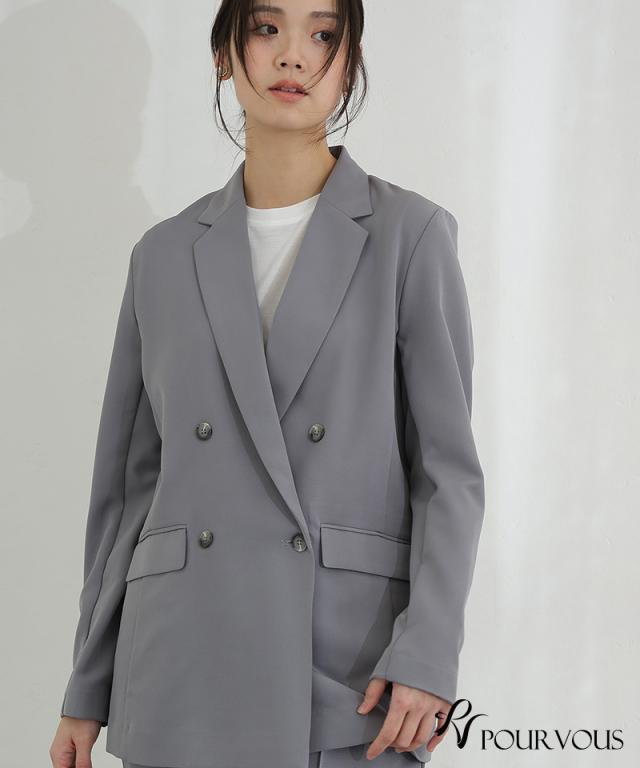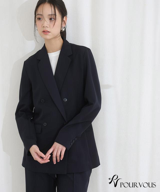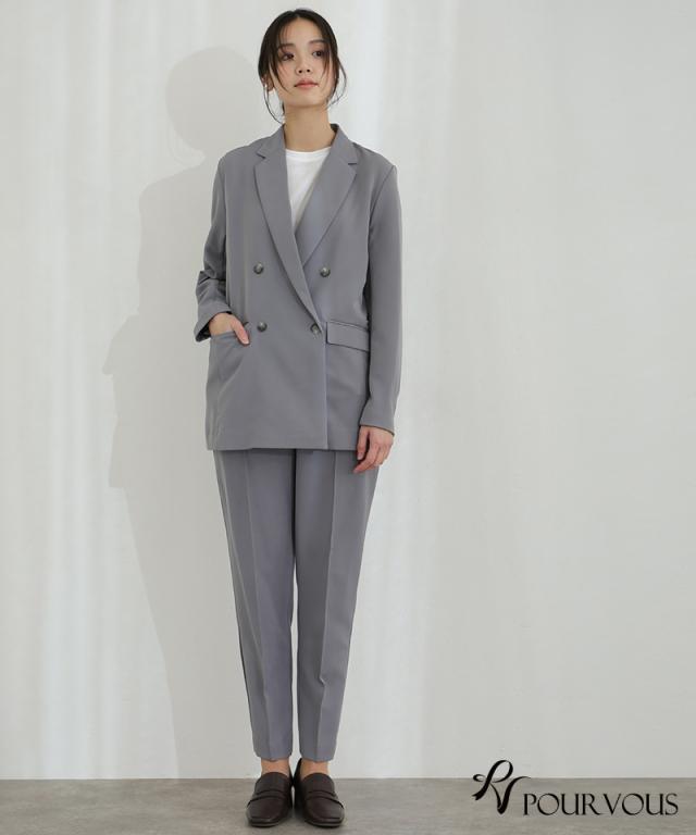 ダブルカラーのジャケットと美しいセンタープレスパンツでスタイリッシュな印象に。