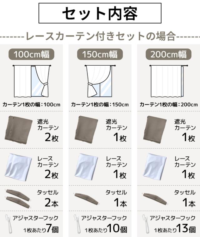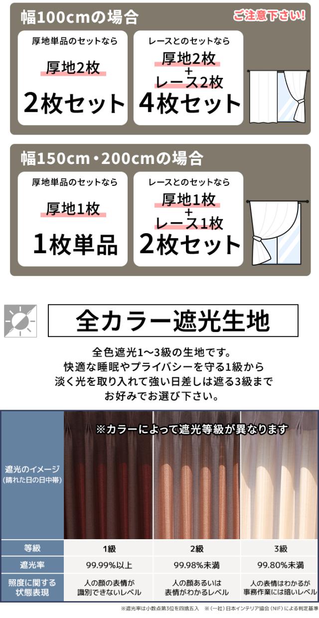 | 遮光カーテン+ミラーレースカーテン お得なセット(Y) 選べる9サイズ・8カラー 幅100cm×135cm/178cm/200cm 遮光2枚・レース2枚 4枚組 幅150cm×丈135cm/178cm/200cm 遮光1枚・レース1枚 2枚組 幅200cm×丈135cm/178cm/200cm 遮光1枚・レース1枚 2枚組 |