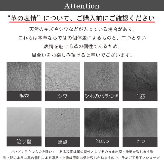 | 注意事項 | 当店で使用している本革は全て本物の革を使用しています。 その為、皮革の模様など掲載画面と異なる場合がございます。 ※ご覧頂いている商品の写真につきましては、できるだけ実物の色に近くなるように努めておりますが、 お使いの環境(モニター、ブラウザ等)の違いにより、色の見え方が実物と若干異なる場合がございます。※ ※掲載商品と色味、模様・柄が異なる理由などのイメージ違いで返品・交換の場合は、返送料お客様ご負担での返送をお願いしております。 予めご了承くださいませ。※ |