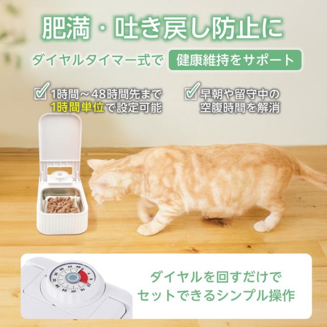 お留守番中も、ウェットフードの新鮮さをそのままに。時間が経ってもおいしさを保ってワンちゃん・ネコちゃんの食欲を促す、ダイヤルタイマー式自動給餌器です。タイマーを回すだけで時間設定も簡単です。