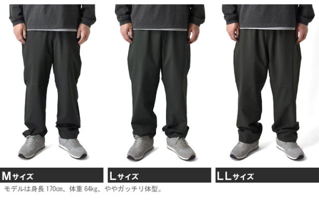 ![]() | Mサイズを着用しました。全体的にルーズな穿き心地です。シルエットはややワイドパンツのようなリラックスした印象です。若干ですが生地にもストレッチが効いているので動きやすく、快適に穿けます。テーパードデザインが足元にかけて程よく細くなるため、ワイド感がありつつもだらしなくならず、スタイリッシュに見えます。 |