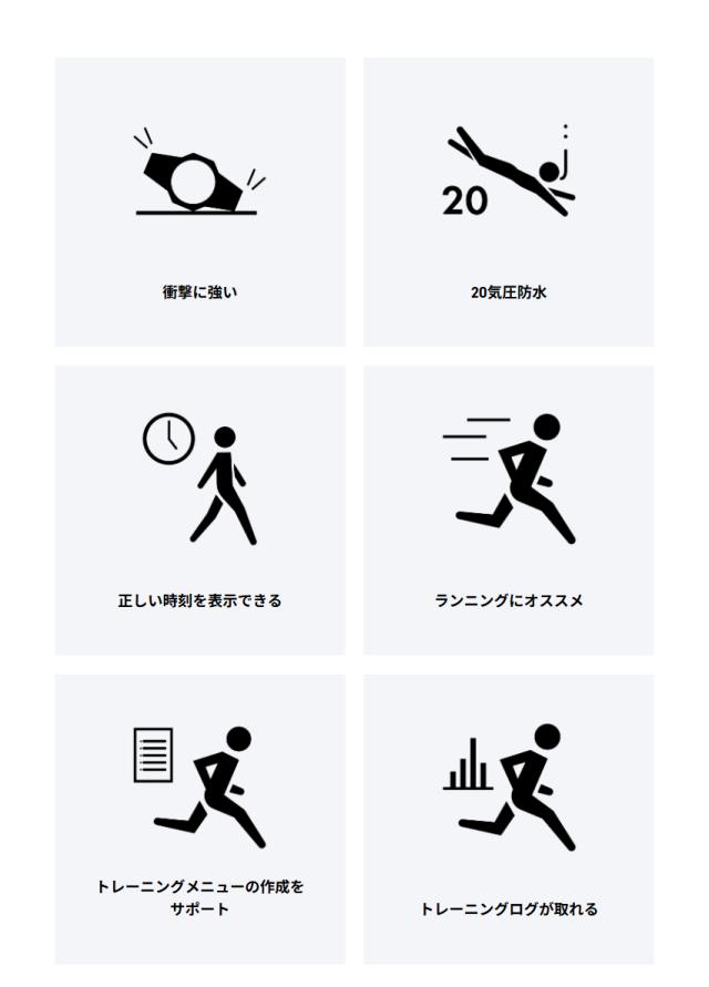 ・センサー機能:トレーニング機能:加速度センサーによる距離・速度・ペースなどを計算して表示、自動/手動ラップ機能、オートポーズ機能、到達お知らせアラート設定(時間、消費カロリー)ON/OFF切替機能、トレーニング表示カスタマイズ機能(計測タイム、距離、ペース、ラップタイム、ラップ距離、ラップペース、平均ペース、速度、平均速度、消費カロリー)