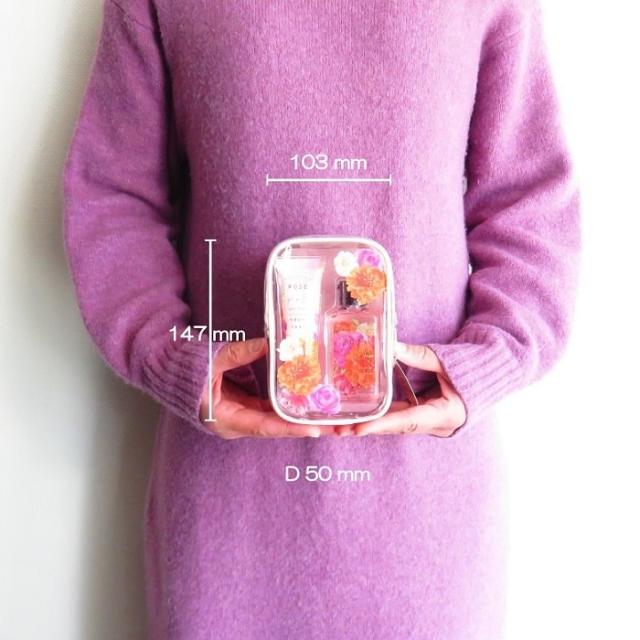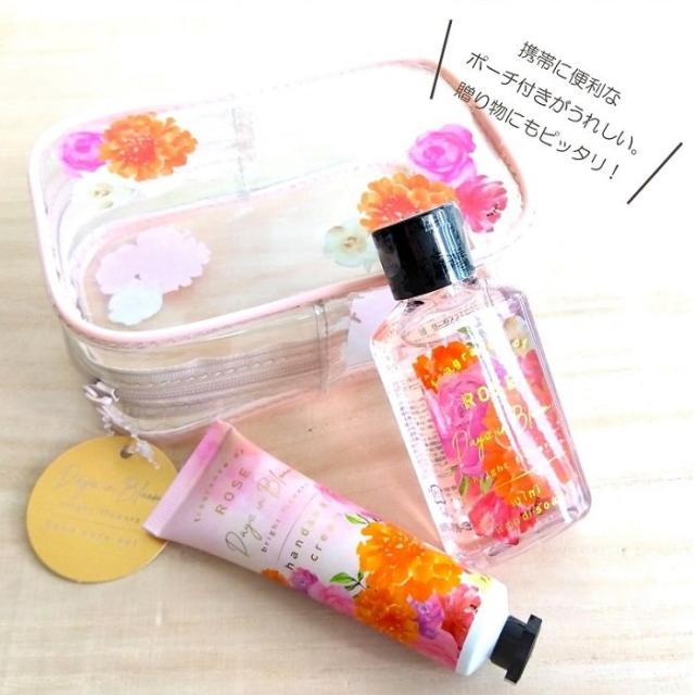 クリア素材と大きな花柄がかわいいポーチに、華やかなローズ香るハンドケアアイテムが入ったセット。