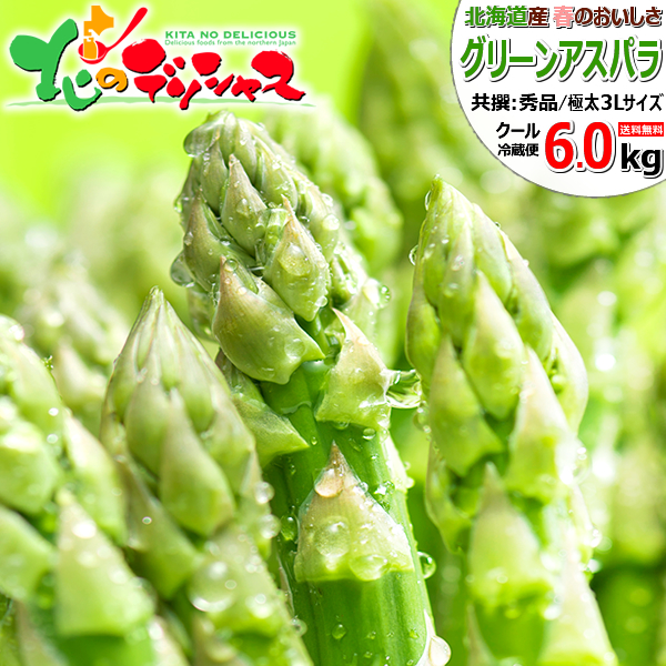 【予約】 北海道産 グリーンアスパラ 6kg (共撰/秀品/超極太/3Lサイズ/冷蔵) 春の味覚 北海道アスパラ あすぱら アスパラ アスパラガス グリーンアスパラ グリーンアスパラガス 緑アスパラ ギフト 贈り物 プレゼント 自宅用 おうち用 野菜 北海道 グルメ お取り寄せ