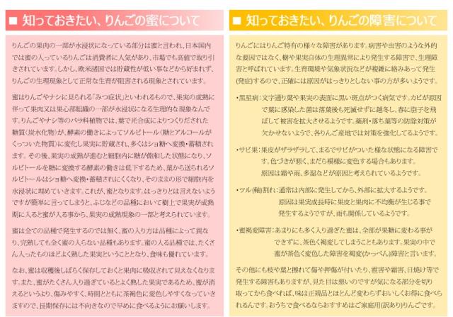 | 商品内容 | ■1箱 3.0kg(8玉〜15玉入り) ※秀品 ・ラ・フランス(4玉〜7玉入り) ・サンふじ (4玉〜8玉入り) ※玉数のご指定はお受けできません! ※蜜入りの可能性あり!りんごの蜜入のお約束はお受けできません! 補足:時期により入らない場合もあります。商品画像や商品説明で蜜入りの画像を使用していますが、旬の時期に最高の状態の蜜入り画像を使用しています!いかなる理由や意見をお客様が述べても、当店ではサンふじりんごの蜜入りは保証致しませんので、ご理解の上でご購入をお願い致します。 ※化粧箱入り(フルーツキャップ) (箱のデザインは予告なしに変更する場合があります) |