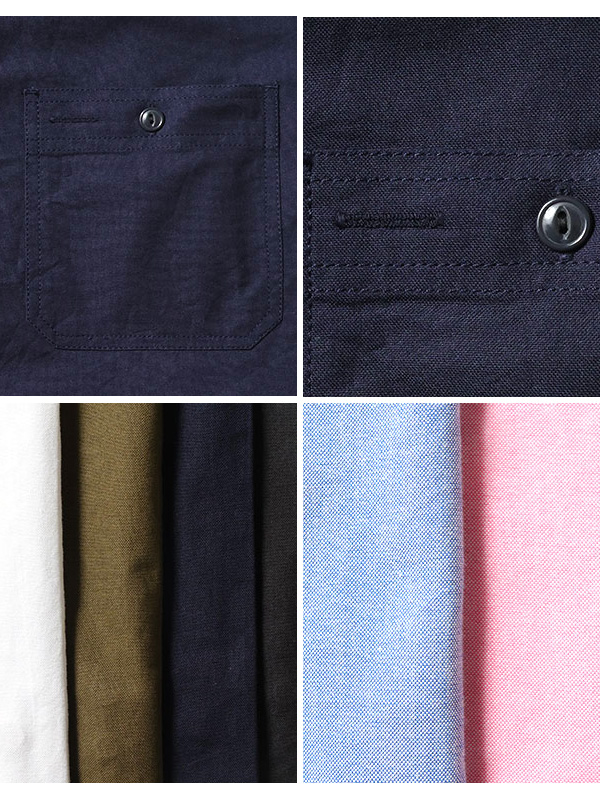 経糸に白糸を使用したシャンブレータイプ(BL,PK)と、生地染めの無地タイプ(WH,OL,NV,BK)の2種展開。