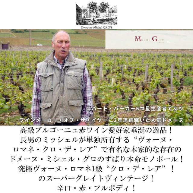 高級ブルゴーニュ赤ワイン愛好家垂涎の逸品!長男のミッシェルが単独所有する“ヴォーヌ・ロマネ・クロ・デ・レア”で有名な本家的な存在のドメーヌ・ミシェル・グロのずばり本命モノポール!究極ヴォーヌ・ロマネ1級“クロ・デ・レア”!のスーパーグレイトヴィンテージ!