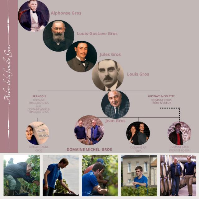 ヴォーヌ村のシンボル、グロ家は19世紀後半にはドメーヌ内で瓶詰し直接販売を始めたという名門。1830年、ニュイ・サン・ジョルジュ村近くショー村のアルフォンソ・グロ氏によって設立。1963年、4代目のルイの引退時に4人の子供が2組に別れ、2つのドメーヌに分割されました。1つはギュスターヴとコレットによる「グロ・フレール・エ・スール」。もう一つが、ジャンとフランソワによる「グロ・ペール・エ・フィス」。後者は73年、2人がそれぞれ独自にワイン造りをすることで再分割され、ジャンが設立したドメーヌが「ジャン・グロ」(後のミッシェル・グロ)、フランソワが設立したのが「フランソワ・グロ」(後のアンヌ・エ・フランソワ・グロ、現在のアンヌ・グロ)となりました。ジャンが95年の収穫を最後に完全引退すると、畑はジャンの子供達3人がそれぞれ相続。長男のミッシェルはドメーヌの建物とモノポールのクロ・デ・レアを始めとする4haを得てミッシェル・グロの運営を強化し、現在に至ります。