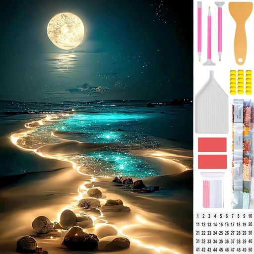 【5 Dダイヤモンドアート キット】海辺の月景 四角いビーズ ダイヤモンドアートには必要なすべてのツールが付属しています。高精細キャンバスx1枚、ダイヤモンドペンx3本(3連ペン+6連ペン+9連ペン)、ダイヤモンドペン専用指の保護するキャップ x 3枚、粘土糊x2個(2x4cm)、ビーズトレイx1個、ラベルステッカーx50点(数値1~50)、調整板x1個、ビーズ収納バッグx60枚、カラフルな四角いビーズ含むる。ダイヤモンド スクエア ビーズの不足を避けるために、ビーズの数を30%増やします。