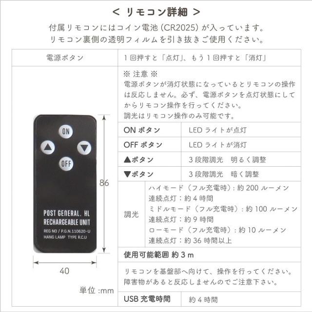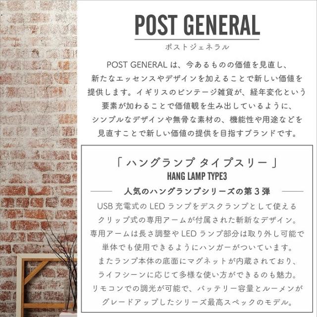 照明 ライト ポストジェネラル ハングランプ タイプスリー LEDランプ USB充電式 クリップ式 3段階調光 リモコン操作 アウトドア 防災 デスクライト インテリア