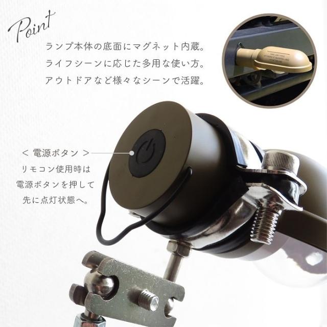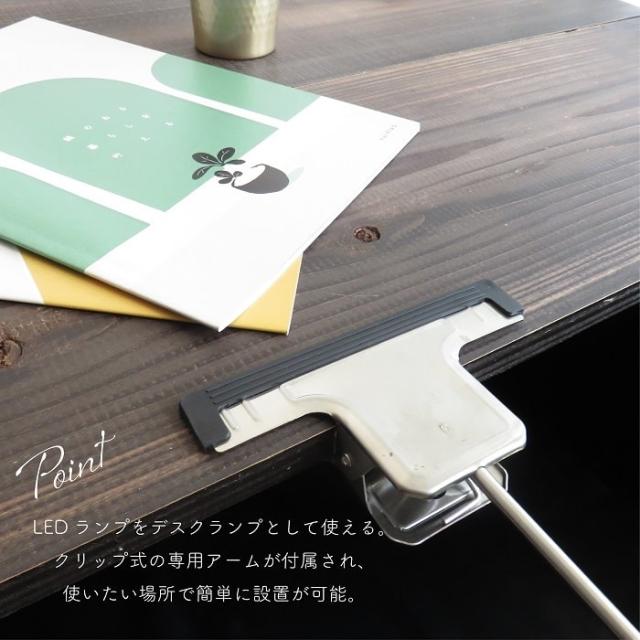 クリップ式の専用アームが付属された斬新なデザイン、専用アームは長さ調整ができLEDランプ部分は取り外し可能。クリップ式なので使いたい場所で簡単に設置が可能。ランプ本体の底面にある電源で簡単にON/OFF。付属のリモコンで遠隔操作も可能。
