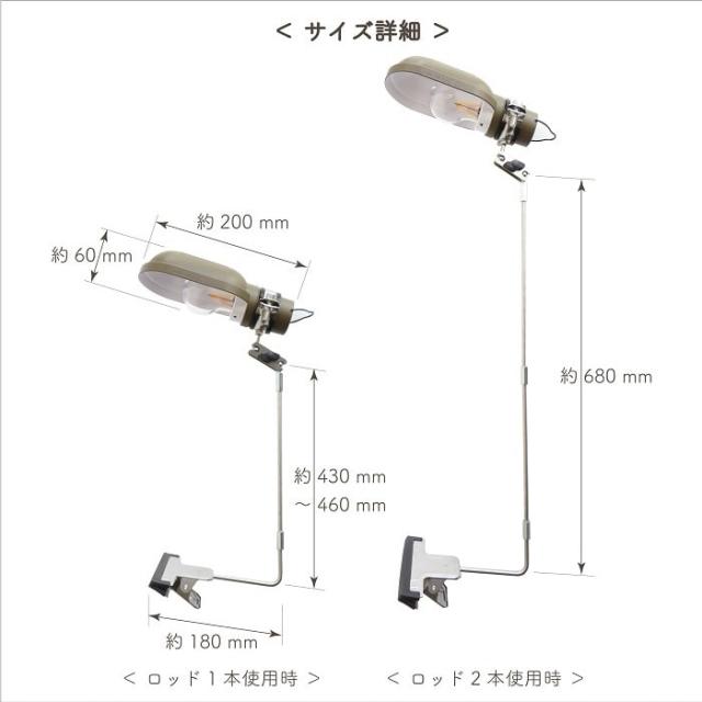 <組立時製品サイズ> シェード部分:約w200×h60×d80mm アーム部分(ロッド2本使用時):約680mm アーム部分(ロッド1本使用時):約430〜460mm(伸縮時) |