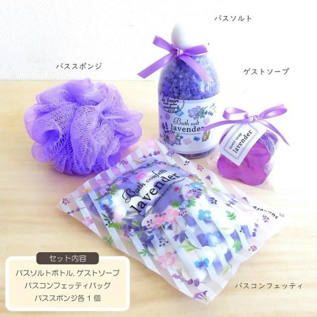 | 内 容 | バスソルトボトル,バスコンフェッティバッグ,ゲストソープ,バススポンジ 各1個 |