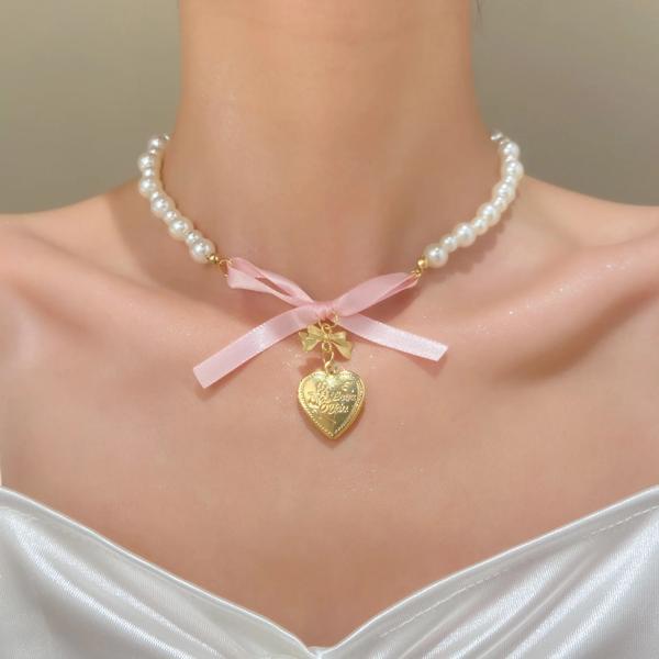 モデル番号:French Romantic Pink Bowknot Heart Pendant Pearl Necklace Jewelry 2024