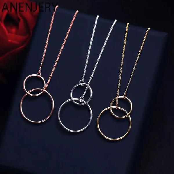 Anenjery-女性のためのダブルサークル付きネックレス シルバーカラー ピンクゴールドチェーン 永遠のジュエリー ギフトのアイデア S-N333