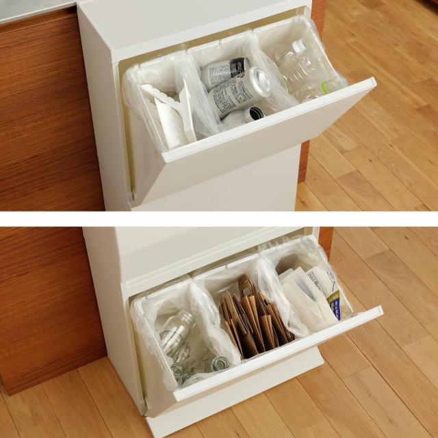 上段・下段それぞれに、袋の持ち手が掛けられるスリット付きです。ボックス内に複数の袋を設置することで細かく分別できます。