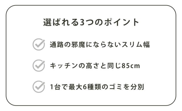 1台で最大6種類のゴミを分別できて省スペースです。分別場所を1か所にまとめられるので、覚えやすく家族共用にもぴったりです。