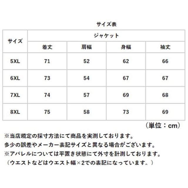 | サイズ | [メンズ] ・5XLサイズ ・6XLサイズ ・7XLサイズ ・8XLサイズ ※サイズについて詳細は、商品画像の中にあるサイズ表をご覧くださいませ。 |