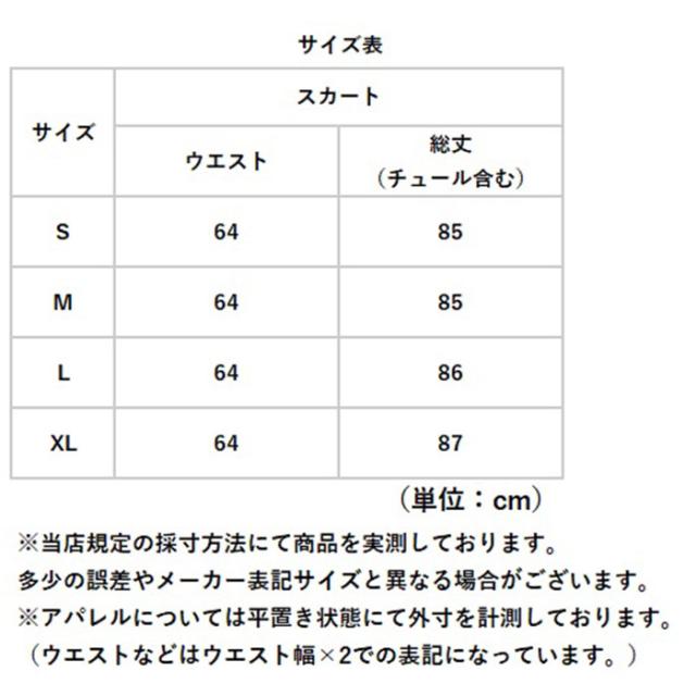| サイズ | [ウエスト]約64cm/[総丈(チュール含む)]約85cm ※当店規定の採寸方法にて商品を実測しております。 多少の誤差やメーカー表記サイズと異なる場合がございます。 ※アパレルについては平置き状態にて外寸を計測しております。 (ウエストなどはウエスト幅×2での表記になっています。) |
