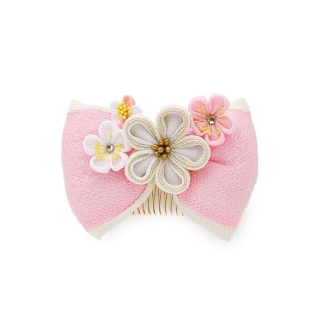 シボのある縮緬(ちりめん)生地を重ねリボンや綿を入れてふっくらとしたリボンに、花々や蝶などをあしらったつまみ細工があしらわれています。
