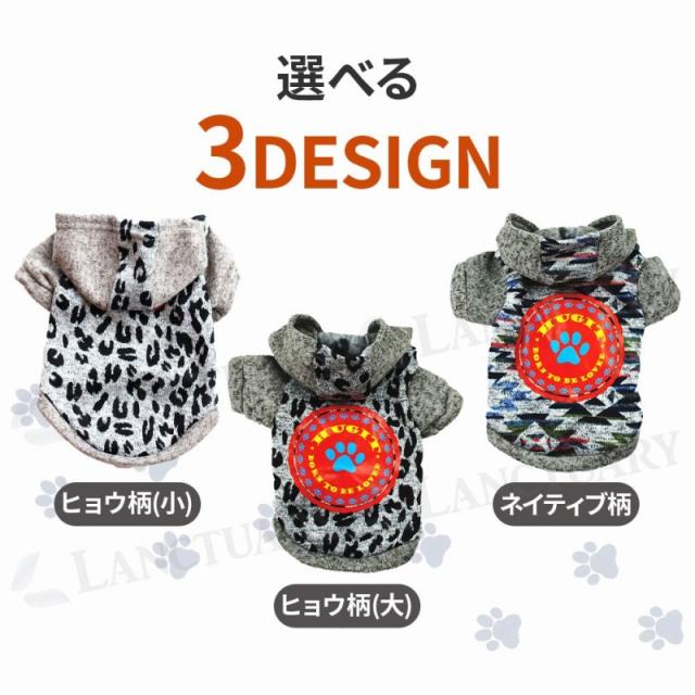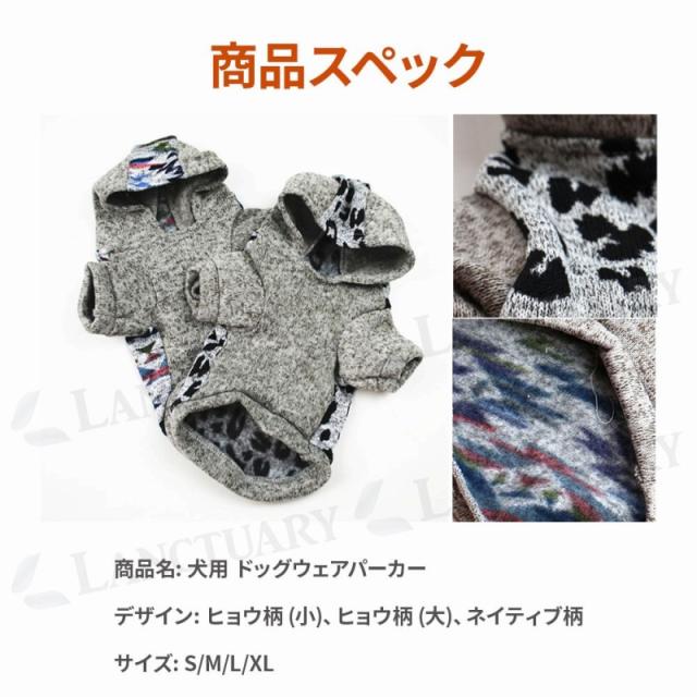 | 主な仕様 | 商品名: 犬用 ドッグウェアパーカー デザイン: ヒョウ柄 (小)、ヒョウ柄 (大)、ネイティブ柄 サイズ: S/M/L/XL |