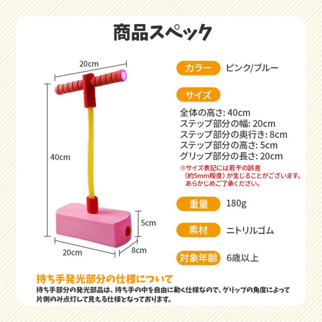 | 主な仕様 | 商品名:バランスホッピング カラー:ピンク、ブルー サイズ: 全体の高さ: 40cm ステップ部分の幅: 20cm ステップ部分の奥行き: 8cm ステップ部分の高さ: 5cm グリップ部分の長さ: 20cm ※サイズ表記には若干の誤差(約5mm程度)が生じることがございます。あらかじめご了承ください。 重量:180g 素材:ニトリルゴム 対象年齢:3歳以上 |
