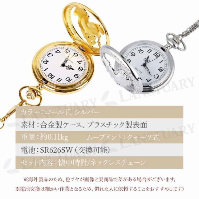 | 主な仕様 | カラー:ゴールド、シルバー 素材:合金製ケース、プラスチック製表面 重量:約0.11kg ムーブメント:クォーツ式 電池:SR626SW(交換可能。※電池交換は細かい作業となるため、慣れた人に依頼することをおすすめします) セット内容:懐中時計/ネックレスチェーン 注意事項:※海外製品のため、色ツヤが画像と実商品で差がある場合がございます。 |
