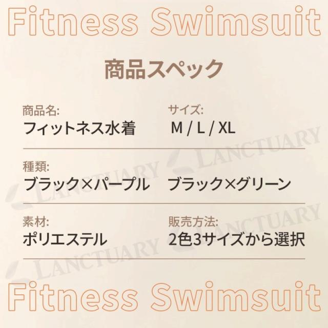 | 主な仕様 | 商品名: フィットネス水着 種類:ブラック×パープル ブラック×グリーン サイズ: M / L / XL 素材: ポリエステル 販売方法: 2色3サイズから選択 |