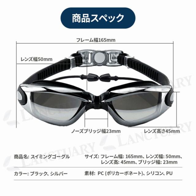| 主な仕様 | 商品名: スイミングゴーグル カラー: ブラック、シルバー 素材: PC (ポリカーボネート)、シリコン、PU サイズ: フレーム幅: 165mm、レンズ幅: 50mm、レンズ高: 45mm、ブリッジ幅: 23mm |