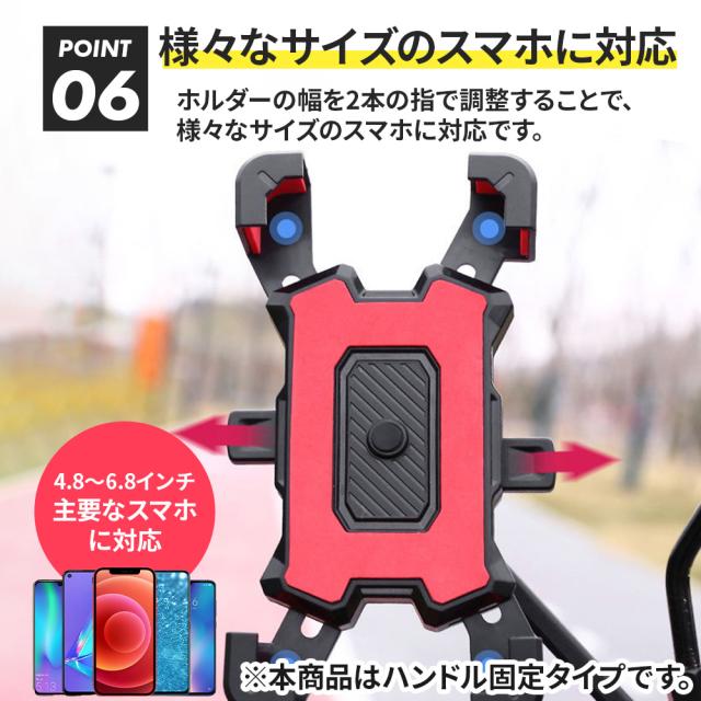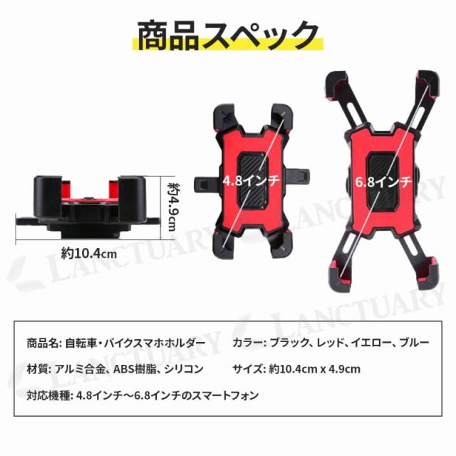 | 主な仕様 | 商品名: 自転車・バイクスマホホルダー 対応機種: 4.8インチ〜6.8インチのスマートフォン 材質: アルミ合金、ABS樹脂、シリコン カラー: ブラック、レッド、イエロー、ブルー サイズ: 約10.4cm x 4.9cm |
