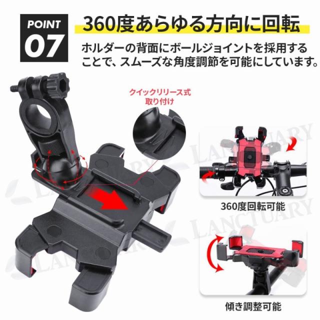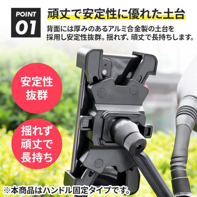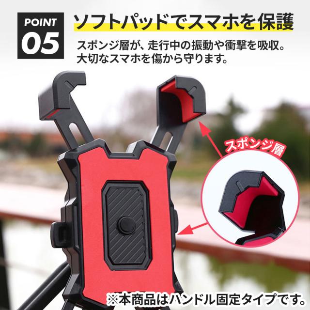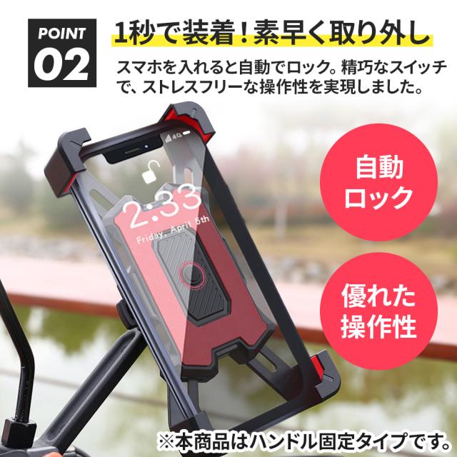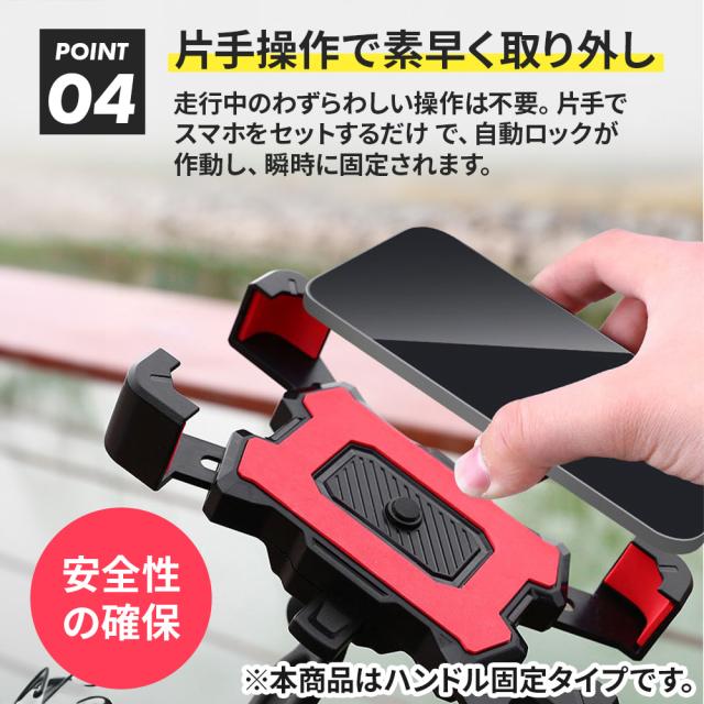 | 商品の説明 | 自転車・バイクスマホホルダーは、サイクリングやツーリングをより快適にする、機能性とデザイン性を兼ね備えたスマホホルダーです。 4.8インチから6.8インチまでの幅広いサイズのスマートフォンに対応しており、iPhoneやAndroidなど、様々な機種でご利用いただけます。ホルダーの四隅には伸縮性のあるアームが備わっており、スマホをしっかりと固定。接触面にはスポンジ層を施しているため、スマホを傷つける心配もありません。 装着はハンドルバーにホルダーを固定し、ノブを回すだけ。工具は一切不要で、誰でも簡単に取り付けられます。クイックリリース式なので、取り外しもスムーズに行えます。 走行中の振動や衝撃からスマホを守るために、厚みのあるアルミ合金製の土台を採用。四つの爪にもスポンジ層を配置することで、安定性を高め、スマホをしっかりとホールドします。ホルダー部分は360度回転し、見やすい角度に自由に調整可能。ボールジョイントを採用しているため、スムーズな角度調節が可能です。 片手操作にも対応しており、停車時に安全にスマホを操作できます。スマホをホルダーにセットすると自動でロックがかかるため、落下する心配もありません。 |